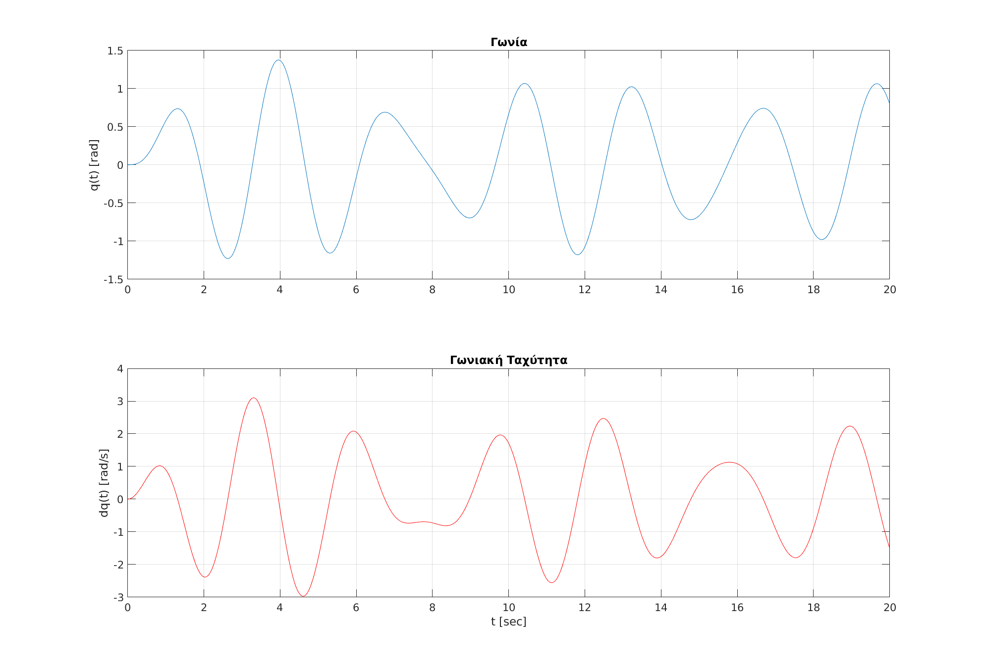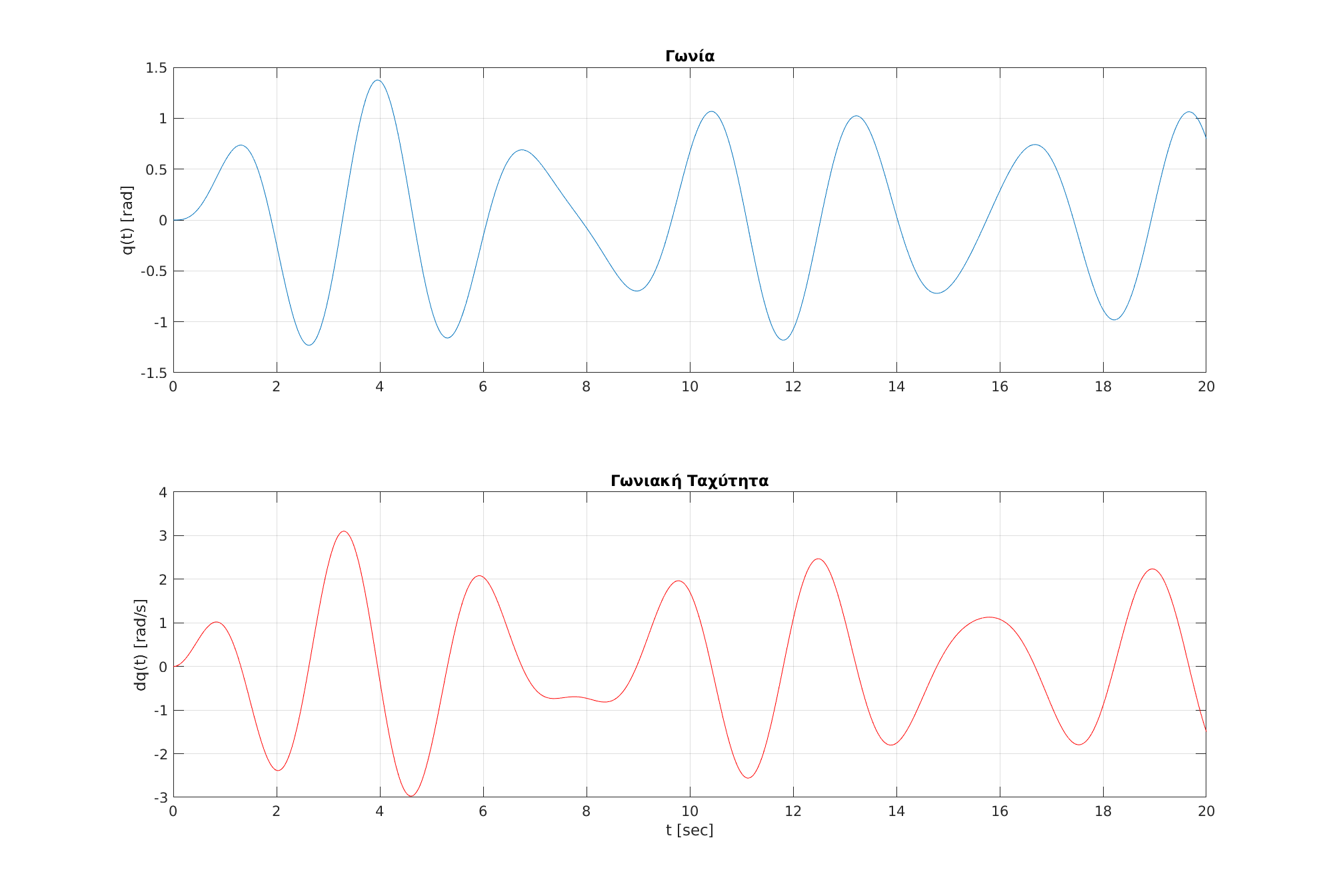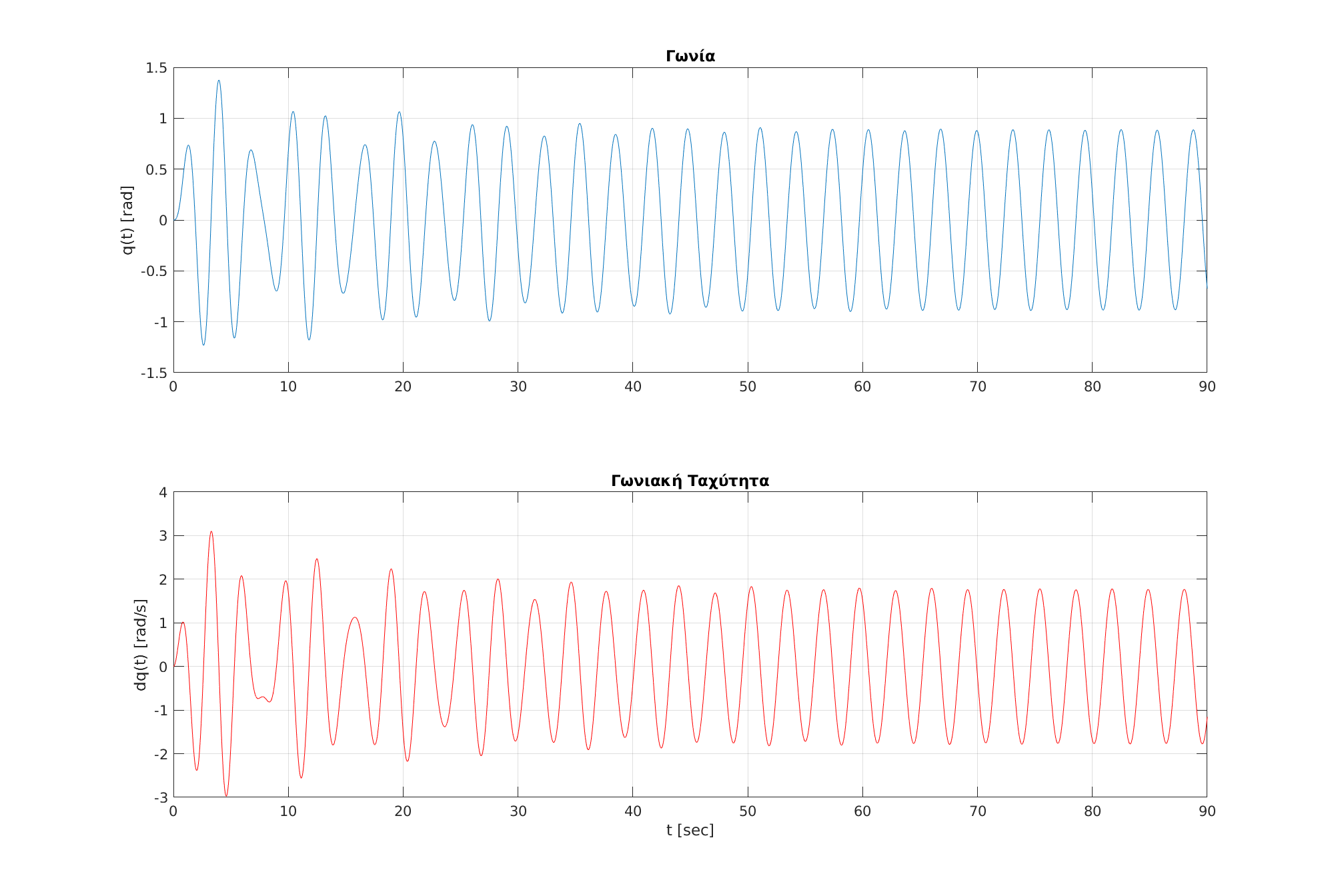 όπου $q(t)$ είναι η γωνία του εκκρεμούς, $u(t)$ η ροπή εισόδου, και $m$, $L$, $c$, $g$ φυσικές σταθερές του συστήματος.