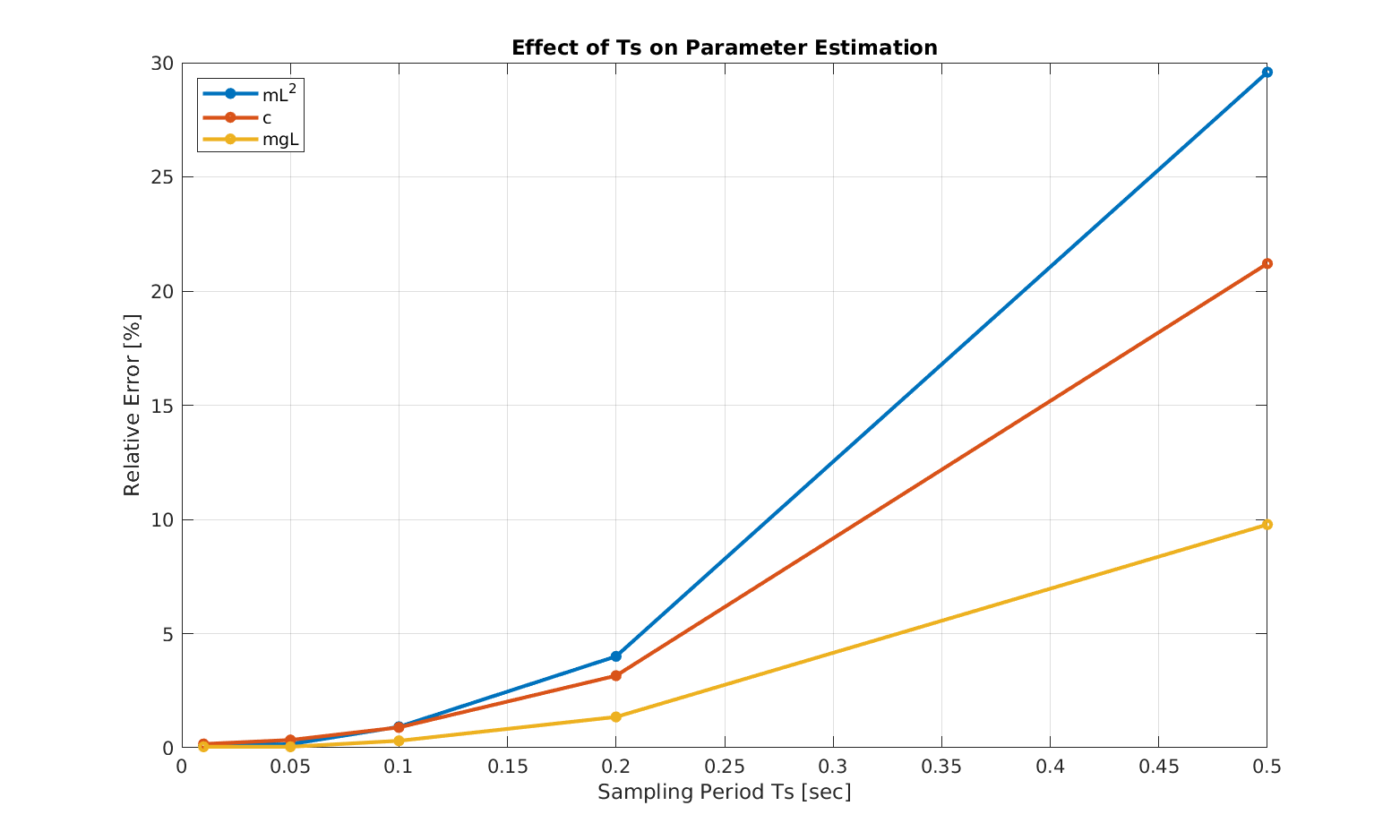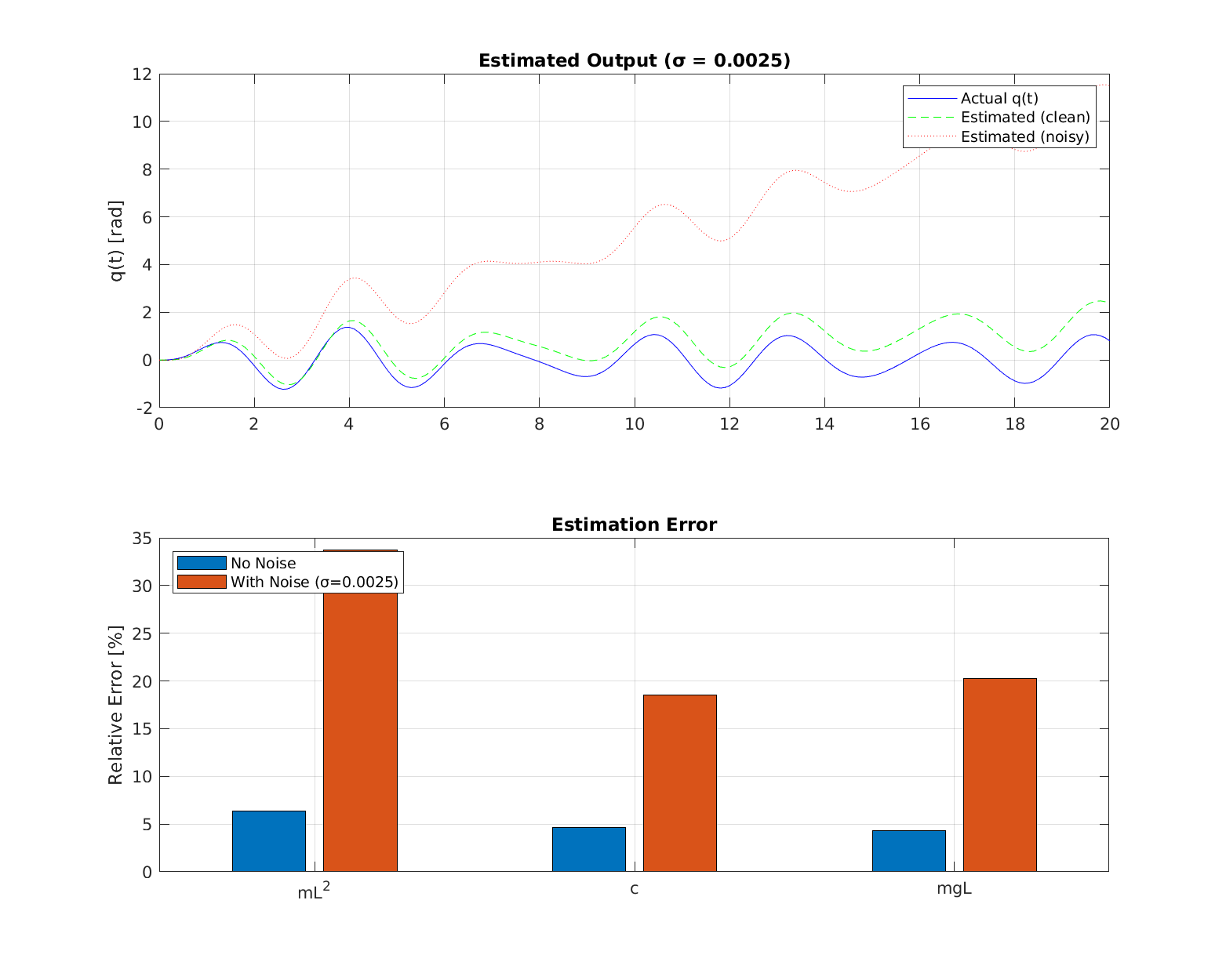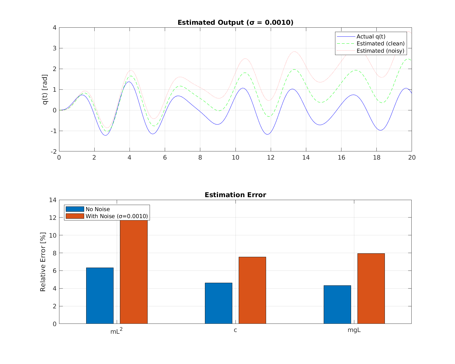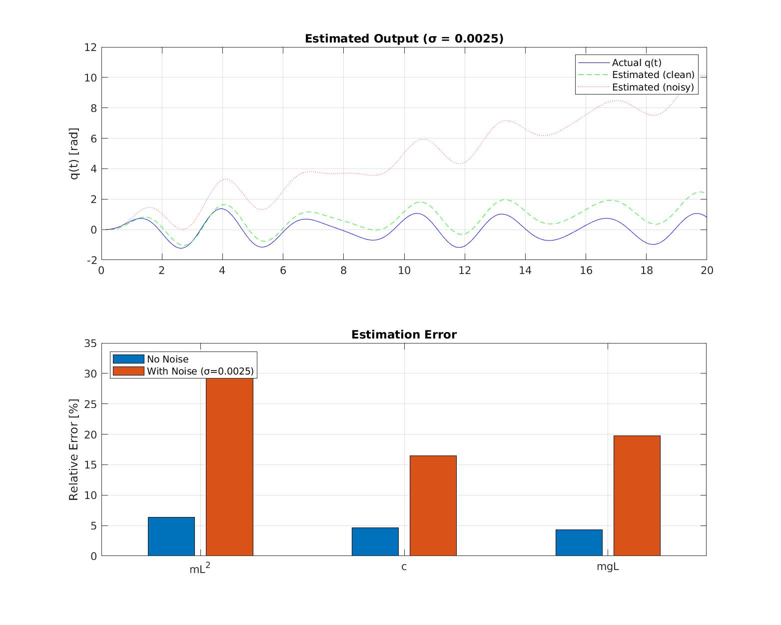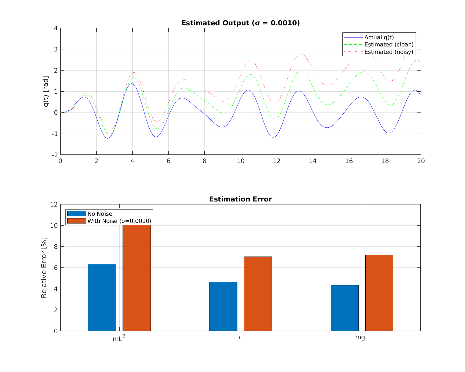 όπου $q(t)$ είναι η γωνία του εκκρεμούς, $u(t)$ η ροπή εισόδου, και $m$, $L$, $c$, $g$ φυσικές σταθερές του συστήματος που αντιστοιχούν στη μάζα, το μήκος του εκκρεμούς, το συντελεστή απόσβεσης και την επιτάχυνση της βαρύτητας.