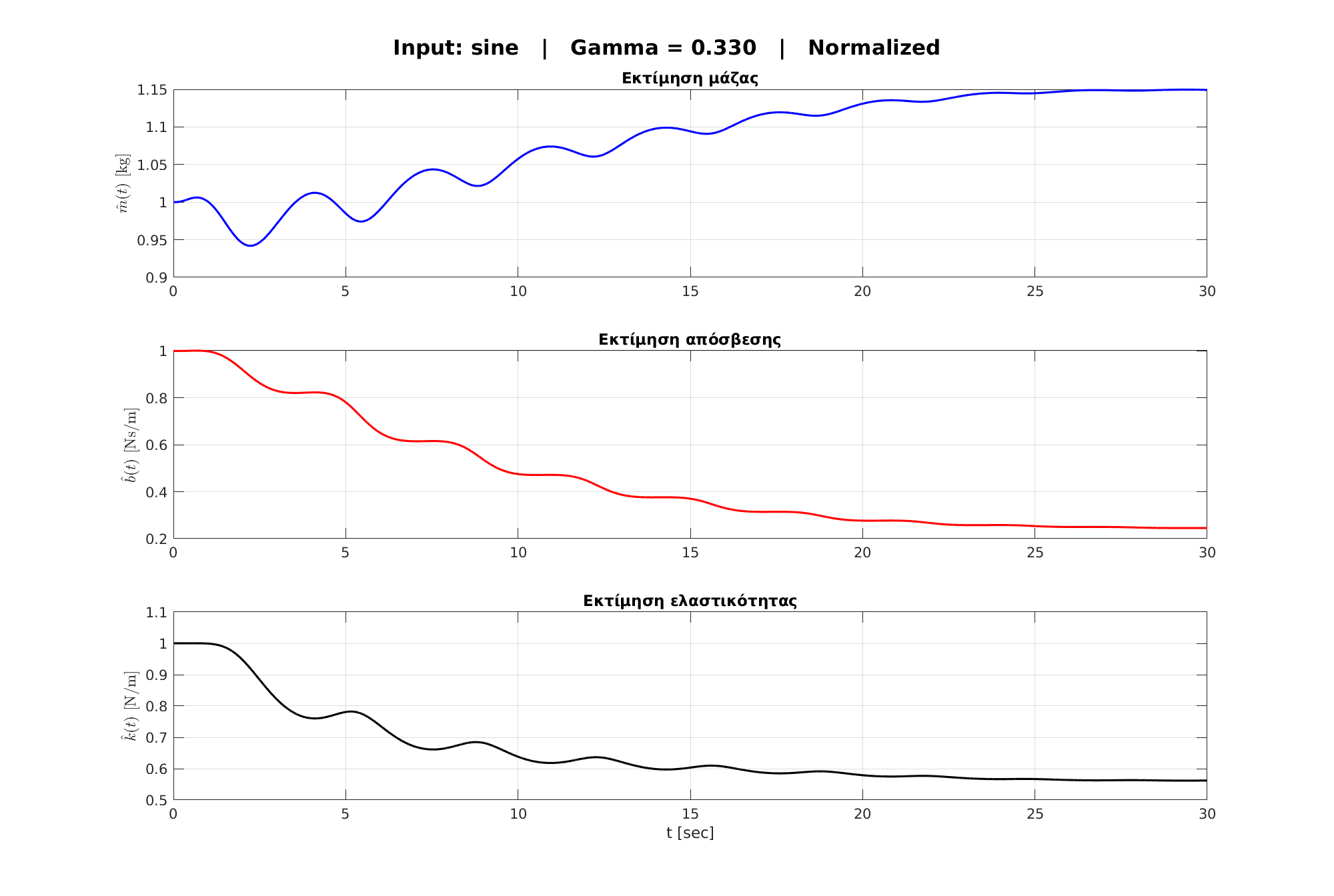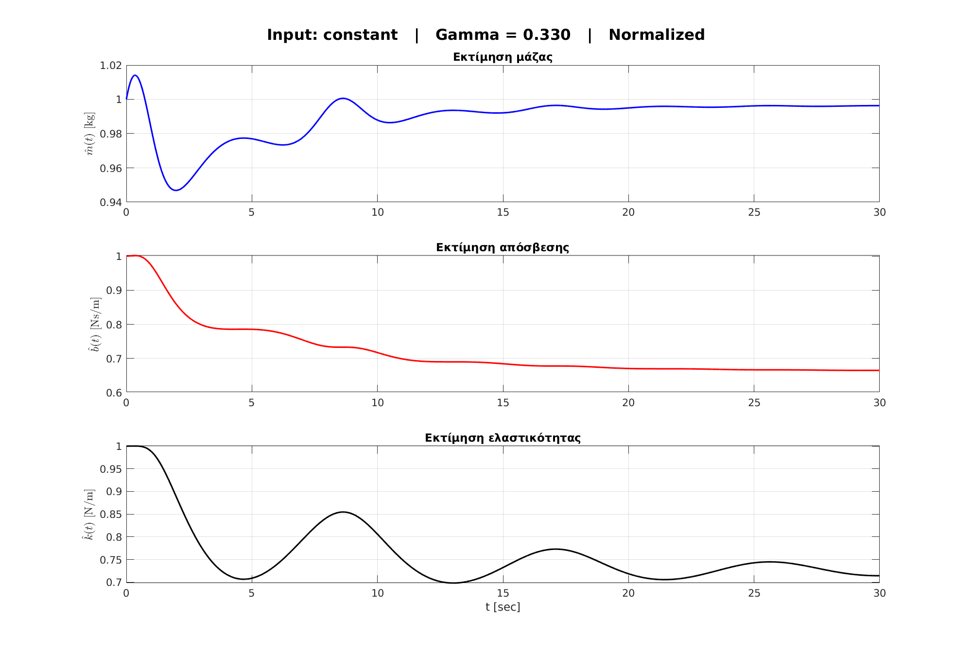 Παρατηρείται ότι οι εκτίμηση για το $b$ συγκλίνει σε τιμές κοντά στις πραγματικές, ενώ η εκτιμήσεις του $m$ και $k$ αποκλίνουν σημαντικά, ομοίως με τη μέθοδο gradient estimation.