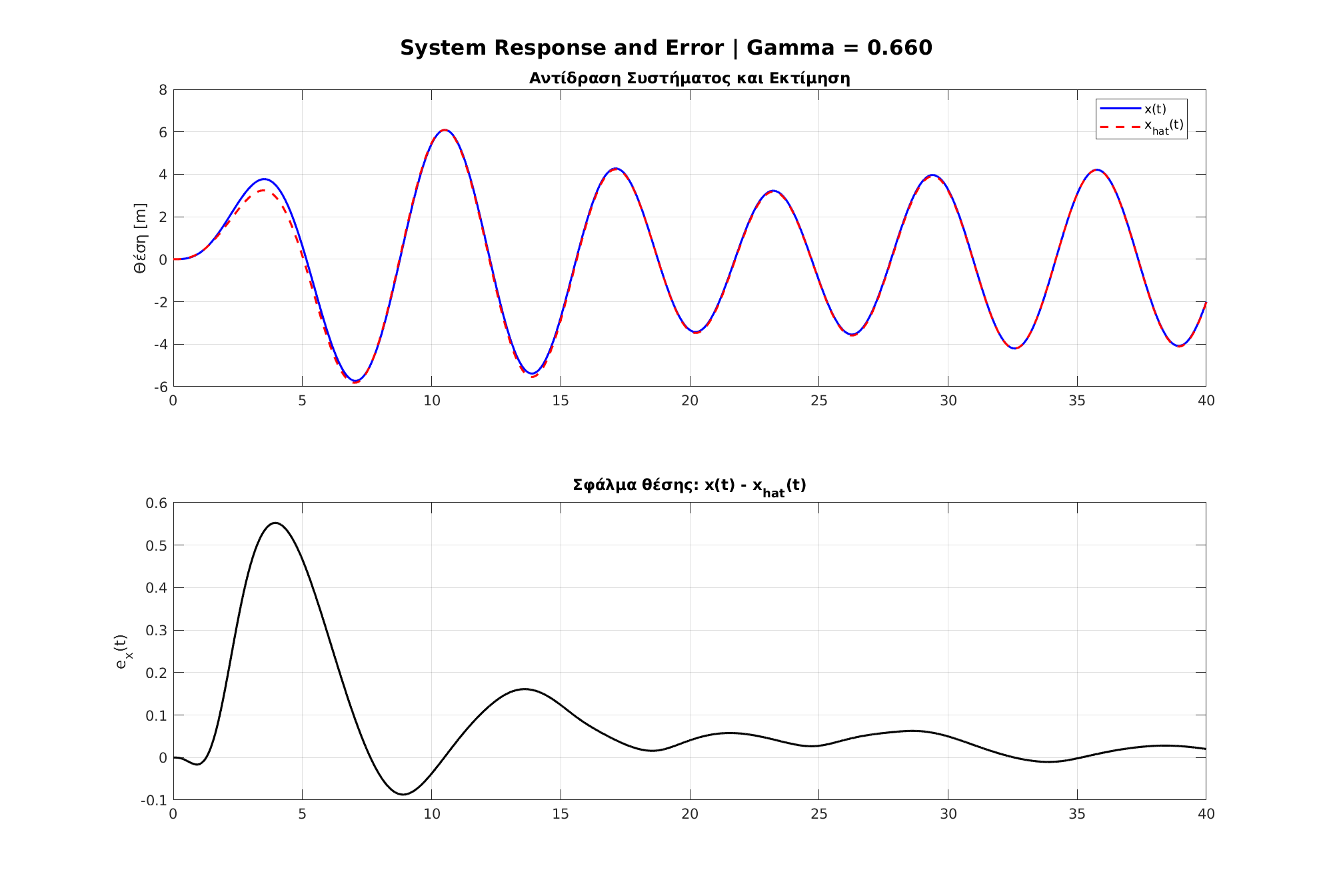 Επιπλέον, ανακατασκευάστηκε η έξοδος του συστήματος $x(t)$ με βάση τις εκτιμώμενες παραμέτρους, ώστε να συγκριθεί η πραγματική έξοδος με την εκτιμώμενη $\hat{x}(t)$ και να υπολογιστεί το σφάλμα $e_x(t) = x(t) - \hat{x}(t)$.