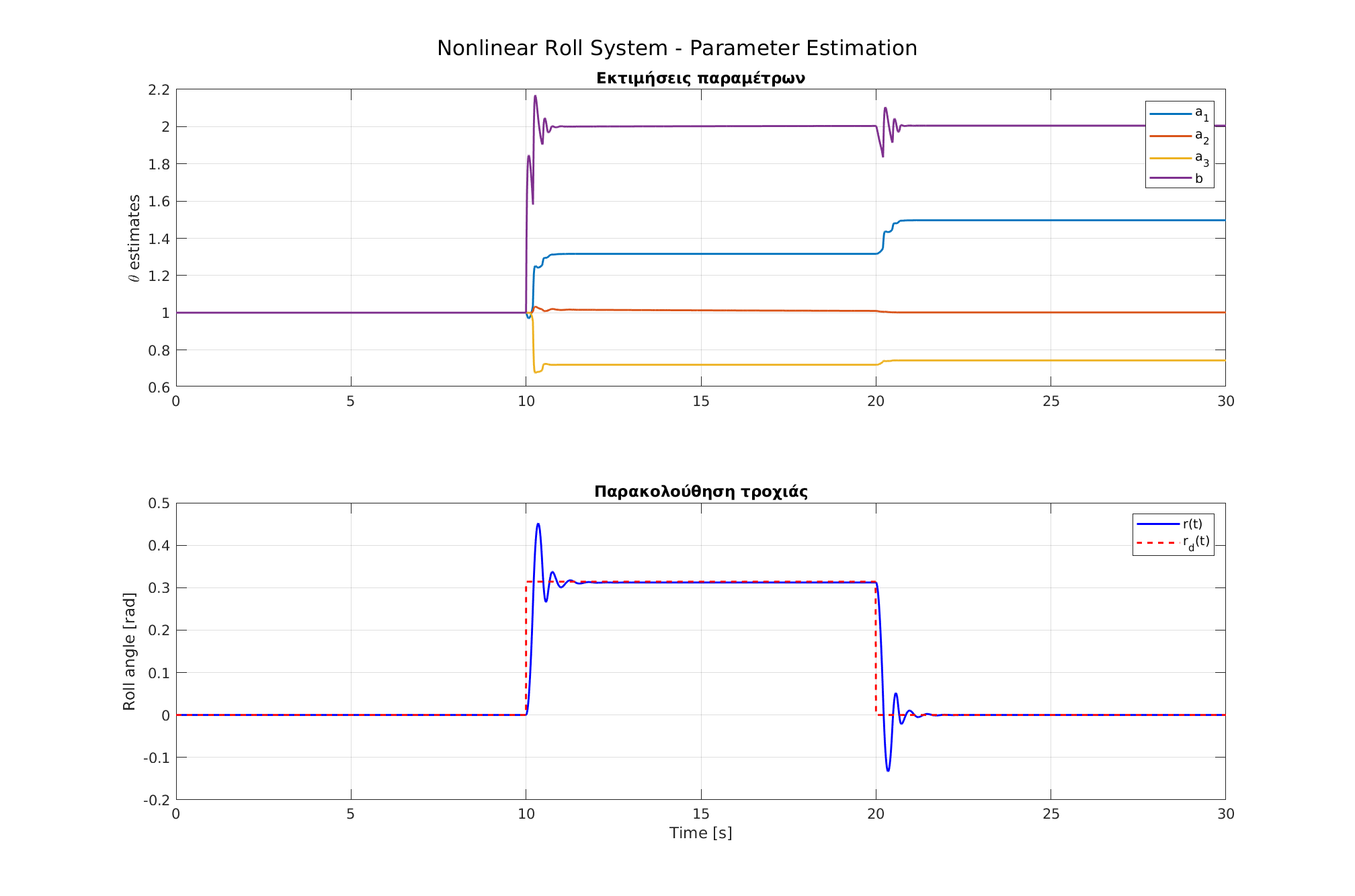 ylabel('Roll angle [rad]'); title('Πραγματικό vs εκτιμώμενο r(t)'); grid on;