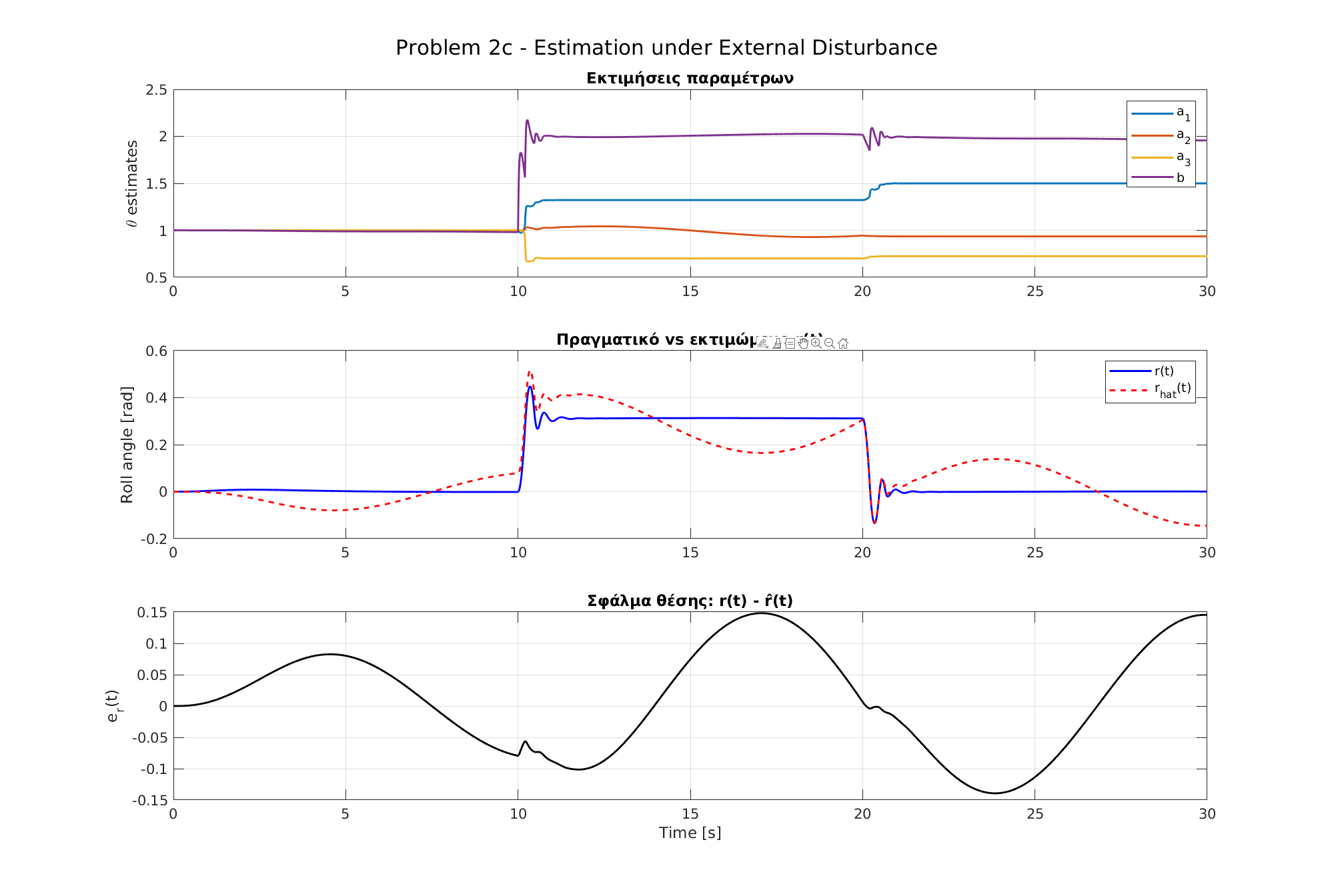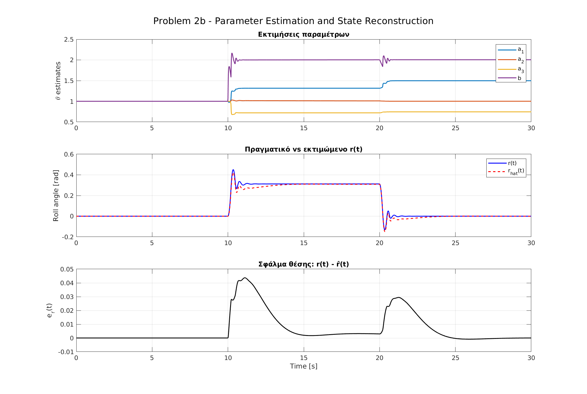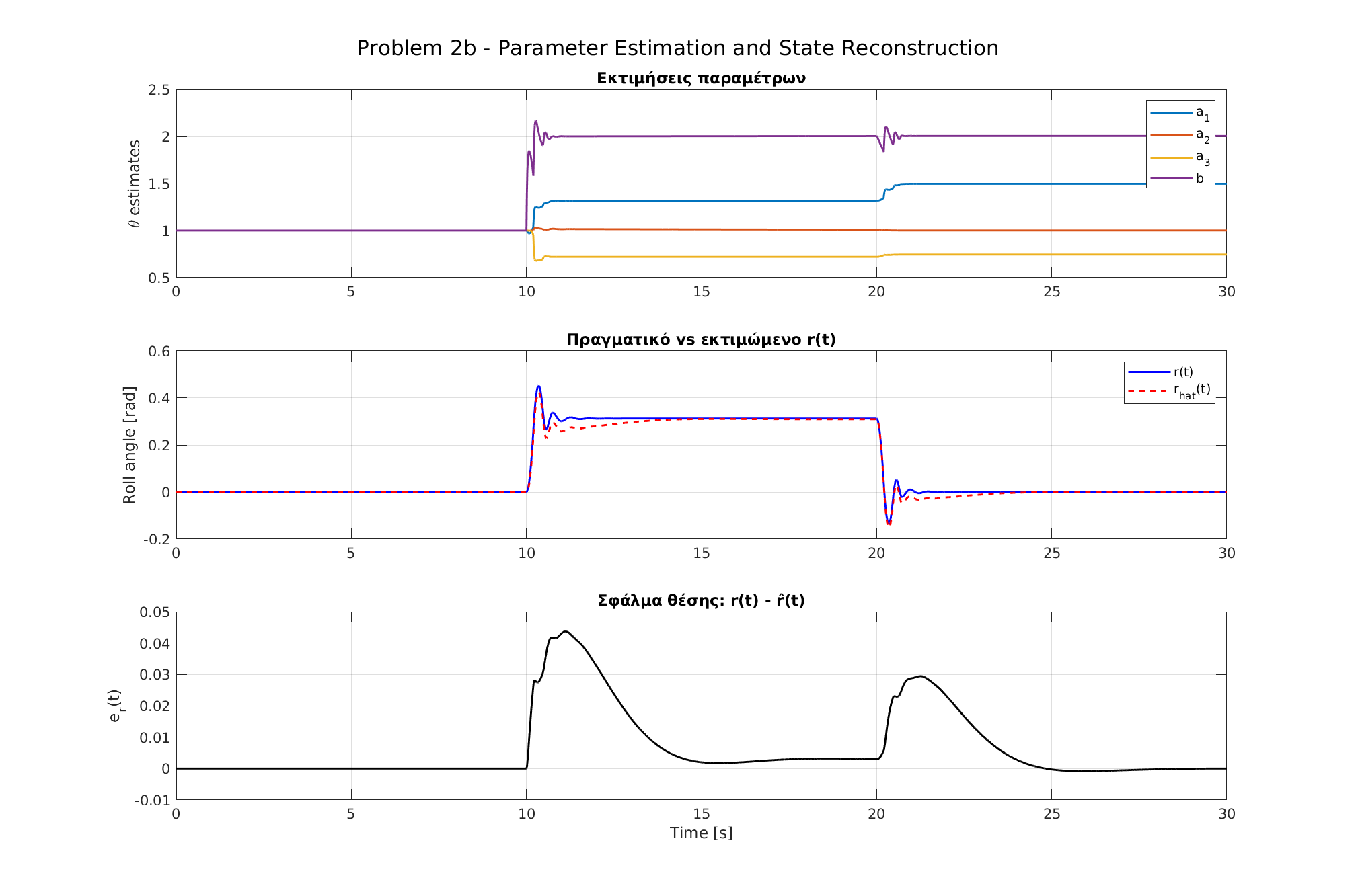 \subsection{2β – Εκτίμηση παραμέτρων και ανακατασκευή κατάστασης με μετρήσιμα r(t), ṙ(t), u(t)}